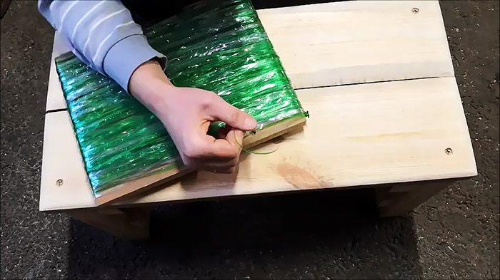 По мере резки лента наматывается на шаблон. В его качестве можно использовать обрезок ДСП или доски размером 250х300 мм. Также подойдет рамка из профиля или рейки. Лента наматывается внатяжку. Каждая новая лента связывается с предыдущей обыкновенным узлом. При намотке важно равномерно распределять мотки, не накладывая в одном месте толстые слои.