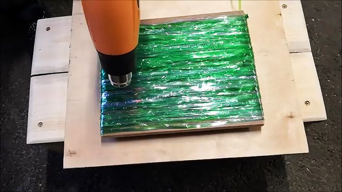 Затем нужно сделать термоусадку ленты. При нагреве она стянется, свернется в трубочку и станет жестче. Усаживать можно монтажным феном на минимальном нагреве. Важно действовать аккуратно, чтобы при прогреве нижних слоев не прожечь верхние ленты. Лучше всего сделать термоусадку кипятком. Можно обдать все сверху несколькими литрами кипящей воды или погрузив конструкцию в нее. Вода обсадит каждый виток равномерно, но она испортит шаблон, если тот сделан из ДСП.