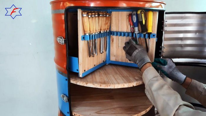 Сверху храним ключи, отвертки, плоскогубцы и т. д. Два сегмента на донце нужны под метизы, середина – под дрель, болгарку и другие электроинструменты, низ – для сварки, кабеля и пр. Тумба легко перекатывается с места на место.