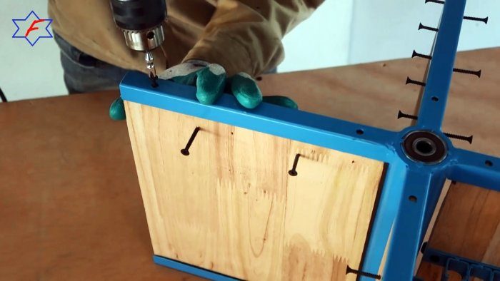 Из мебельного щита вырезаем 4 равных прямоугольника. Вкручиваем по верху шурупы, а по середине поперек закрепляем пластины с профилями.