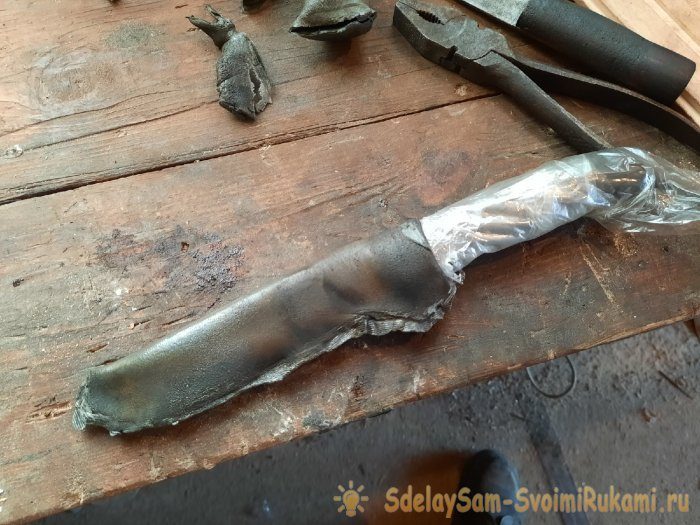 После того как клей высохнет, я свернул ножны обратно и пропаял шов, нагревая их посильнее и сжимая плоскогубцами.