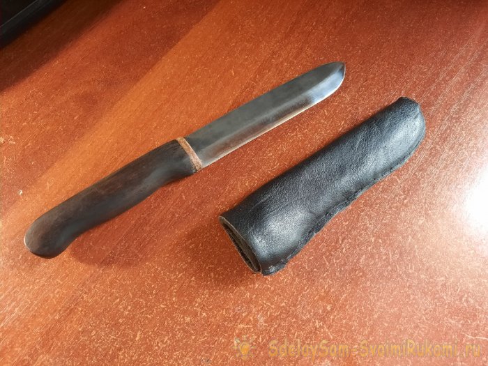 По большому счету, если работать поаккуратнее, то можно на этом было и остановиться. Но я изначально хотел ножны кожаные. Поэтому я взял кожу уже получше, приклеил ее сверху и по бокам ножен и прошил седельным швом снизу.