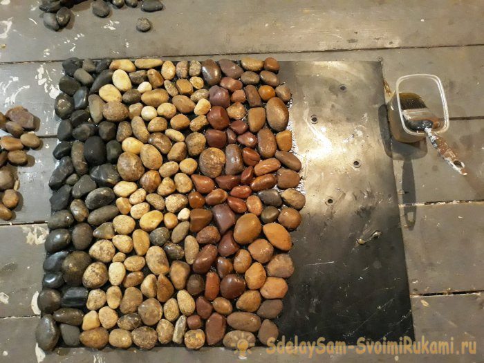 4 этап. Подетально смазывайте клеем коврик и камни, оставляйте минуты на 2-3, затем плотно прижимайте клеевой стороной камни к коврику.