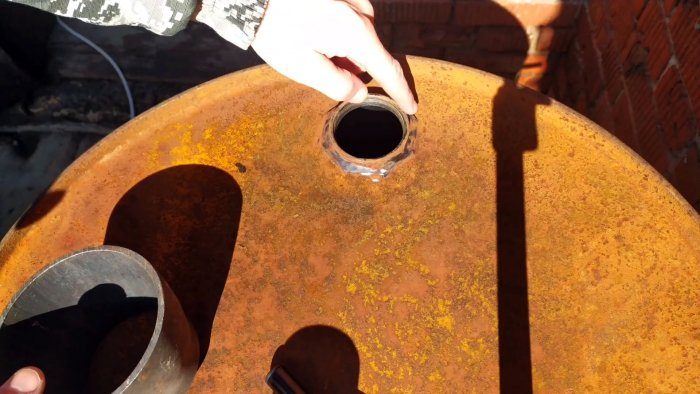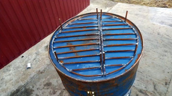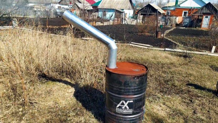 Данная печь представляется собой бочку с дымоходной трубой в крышке, и боковыми дверцами для загрузки дров. Внутри нее располагаются составленные с двух частей колосники на ножках. На них устанавливается вертикально 3 сухих полена длиной по 50 см.