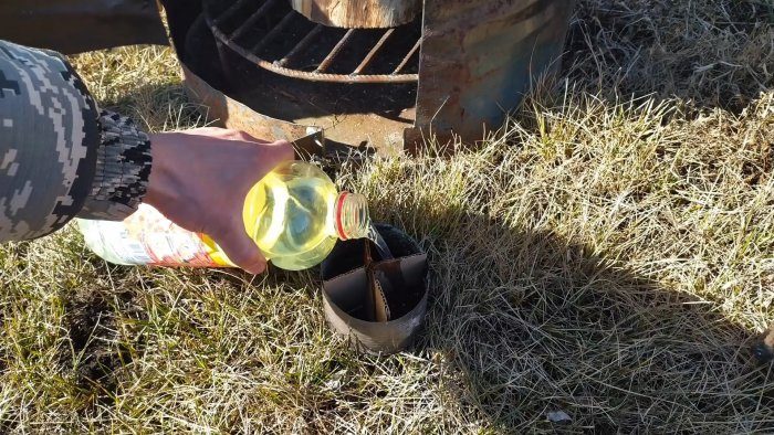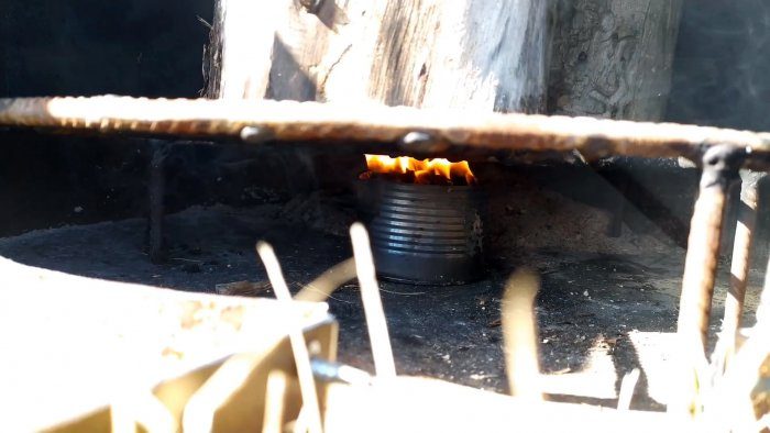 Получается так называемая «таежная свеча», горящая 12 часов. Для розжига печи используется консервная банка с вставленным фитилем из гофрокартона, заправляемая дизелем.
