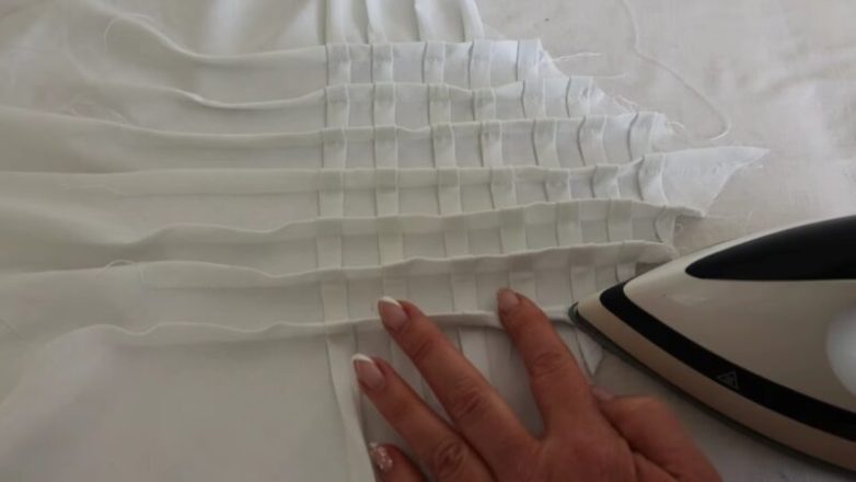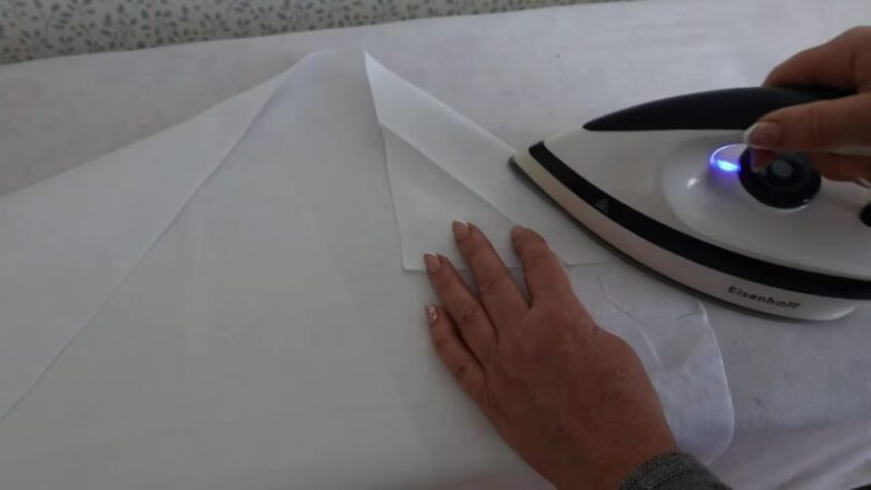 Проложите фиксирующие строчки. Разутюжьте ткань и проделайте аналогичную процедуру по другой диагонали.
