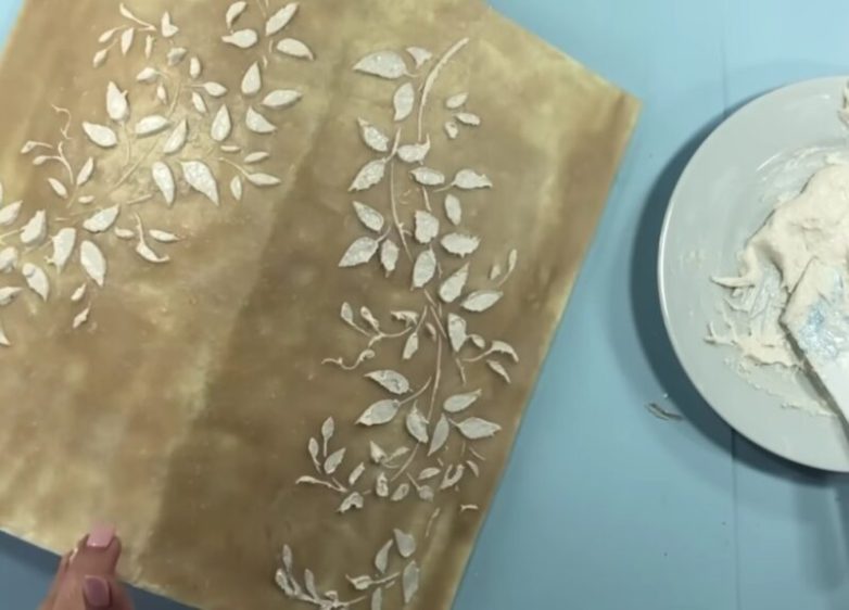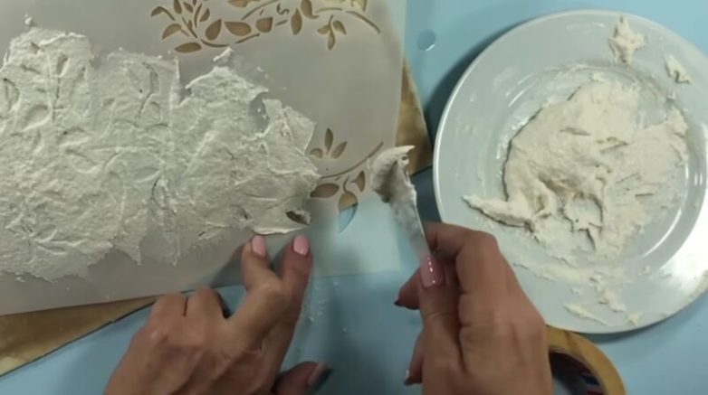 Подготовьте еще одну порцию пасты (в данном случае не добавляйте воду, используйте только уксус, необходимо получить мягкую кремовую консистенцию). Используя трафарет и вторую порцию пасты, нанесите на вазу красивые узоры.