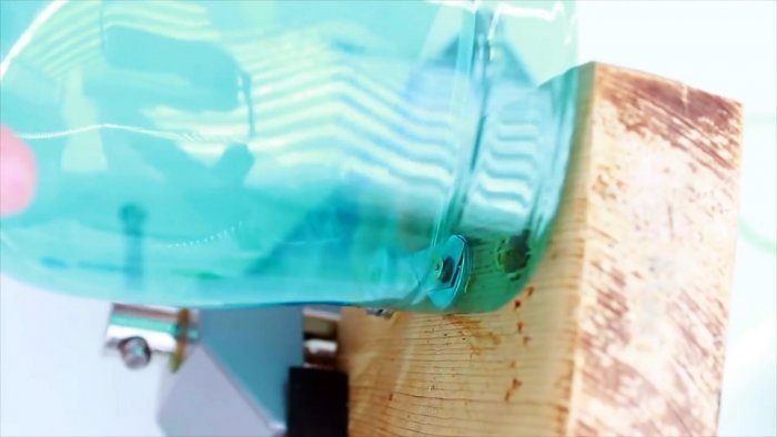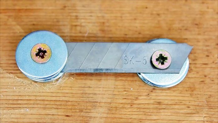 Сначала нужно сделать станок для нарезания пластиковых бутылок на ленты. Для этого лезвие ножа прикручивается саморезом через отверстие к дощечке. Предварительно под него подкладывается 2 шайбы. Второй его конец поджимается также, но поскольку на нем нет отверстия, то нужно подложить 2 шайбы снизу и одну сверху.