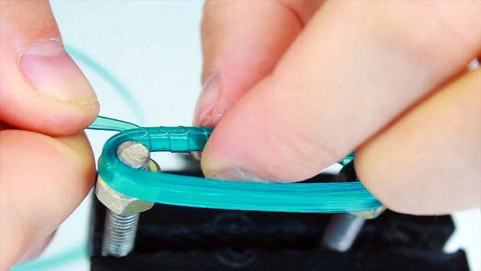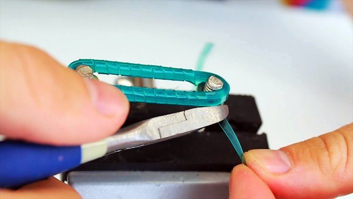 У пластиковых бутылок срезается дно, делается тонкий надрез по окружности и полученная лента заводится под лезвие станка. Далее прижимая бутылку за горлышко вниз на дощечку нужно тянуть за срез. В результате режется длинная лента шириной 3,1 мм.