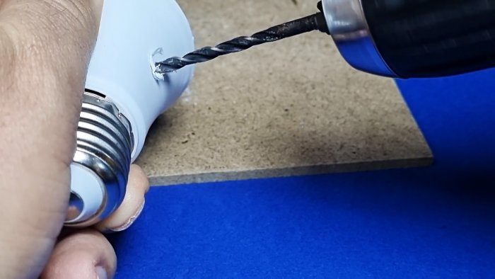 Сбоку в корпусе лампы сверлим отверстие под переменный резистор.