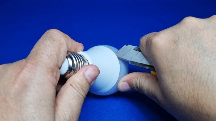 Первым делом необходимо отклеить колбу. Делается это просто при помощи канцелярского ножа. Обрезается клей по кругу.