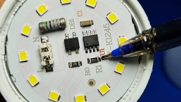 В данной модели лампы драйвер питания светодиодов установлен непосредственно на плате вместе со светодиодами. Сам импульсный драйвер построен на микросхеме «MLS3535». Даташит и схему на включение которой можно без труда найти на просторах интернета. Резистором на плате U1 задается мощность свечения светодиодов.