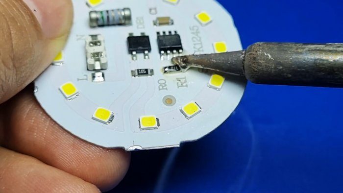 Отключаем плату от цоколя. Выпаиваем резистор номиналом 10 Ом.