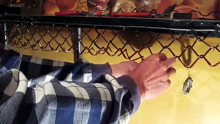 Сделав достаточное количество сегментов нужно сплести их в сетку. Для этого первый из них подвешивается горизонтально. После этого в него вплетается второй сегмент, во второй третий и т.д. У краев сегменты связываются тонкой медной проволокой. Для удобства следует цеплять на каждый последний сегмент грузила, чтобы сетка оттягивалась вниз, и в нее было легче вплетаться.