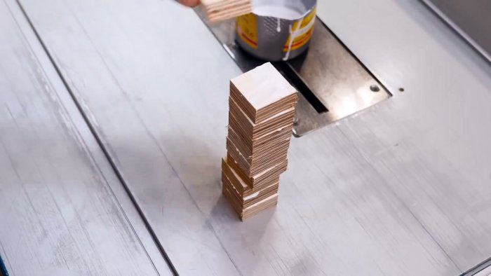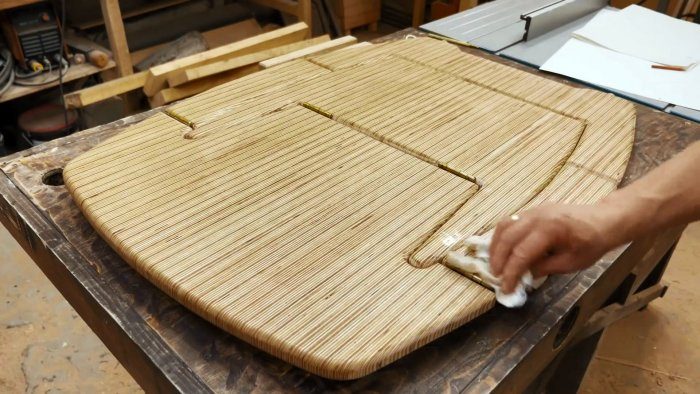 Чтобы сделать кресло, нужно нарезать имеющуюся фанеру на полосы шириной по 20 мм, и склеить из них большой мебельный щит. Ламели при этом должны располагаться боком, чтобы он получился жестким.