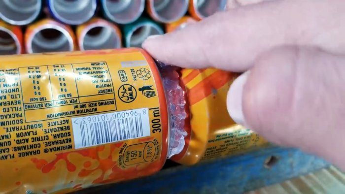 Далее сначала термоклеем, а потом силиконом нужно склеить банки в длинные трубки. Термоклей позволяет их скрепить на начальном этапе, пока не схватится герметик.