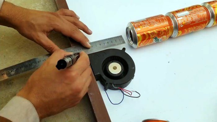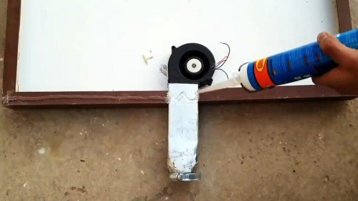 В корпусе коллектора нужно прорезать окно для вентилятора и закрепить его выдувом наружу. При этом на улитку ставится переходной патрубок для подключения к гофрированной трубе. Его можно выгнуть из банки от аэрозольной краски.