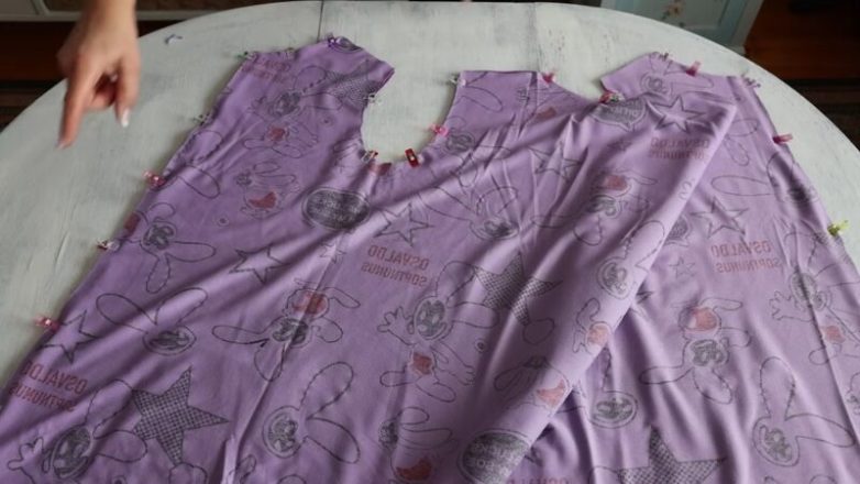 Сложите ткань пополам лицевой стороной к лицевой стороне. К линии сгиба приложите выкройку спинки, а к боковому шву — выкройку полочки. В итоге получится одна цельнокроенная деталь.