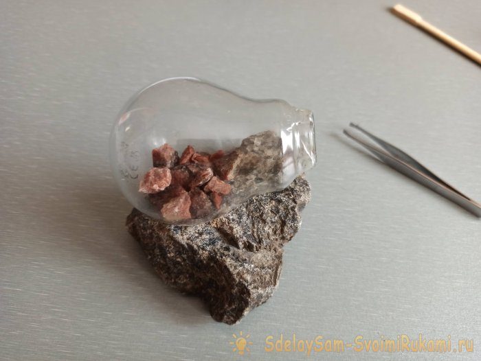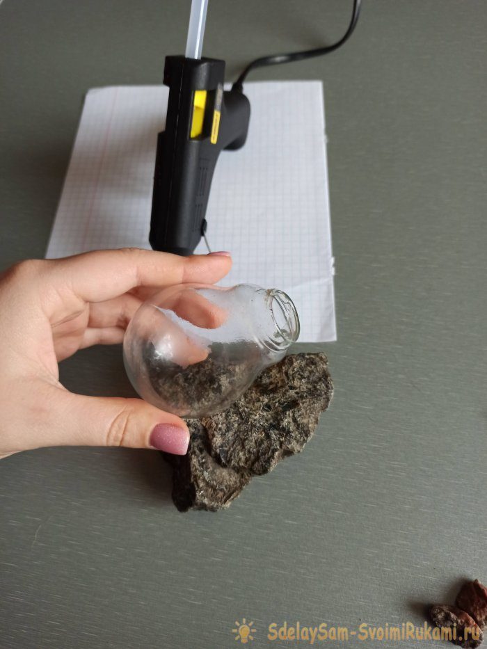 Прикрепим саму лампочку на большой камень термоклеем.