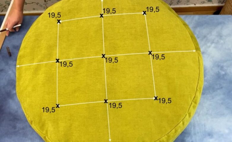 Отверстие зашейте вручную нитками в цвет. На нижней и верхней стороне пуфа сделайте разметку как показано на фото.