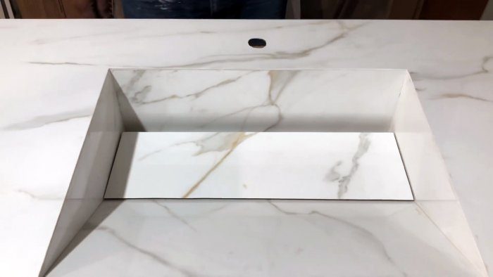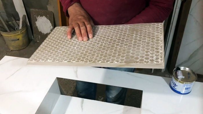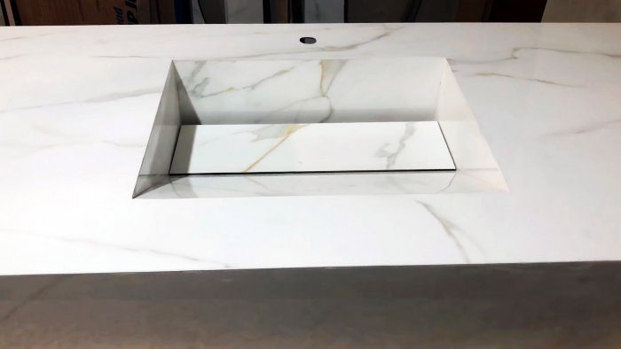 В целой крупноформатной плитке, соответствующей размеру желаемой столешнице, нужно выпилить в центре прямоугольное отверстие под раковину.