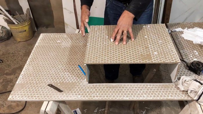 После схватывания клея столешница переворачивается, и на 3 стенки приклеивается дно. Для него заусовка не нужна. Потребуется только немного сточить глазурь по краям, чтобы повысить адгезию.