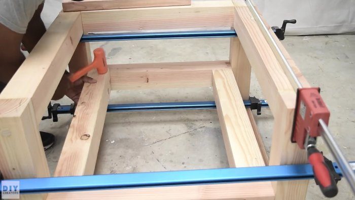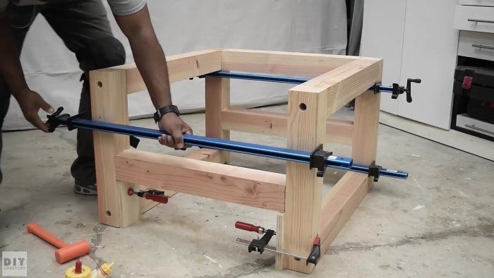 Собираем боковины изделия на клей, смазывая им с помощью кисти, торцы и ответные части сопрягаемых деталей, и стягиваем с помощью регулируемых по длине струбцин, желательно на ровной горизонтальной поверхности.