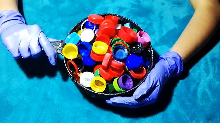 Чтобы не поранить руки об острые края крышек, надеваем перчатки и укладываем сырье в сковороду. Пользуемся защитной маской, и ставим посуду с колпачками на газовую плиту.