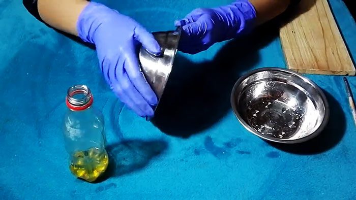 Смазываем металлические чашки растительным маслом: одну – изнутри (матрица), другую – снаружи (пуансон). То же проделываем и с рабочей частью мастерка. Это нужно для того, чтобы расплавленный пластик не прилипал к металлу.
