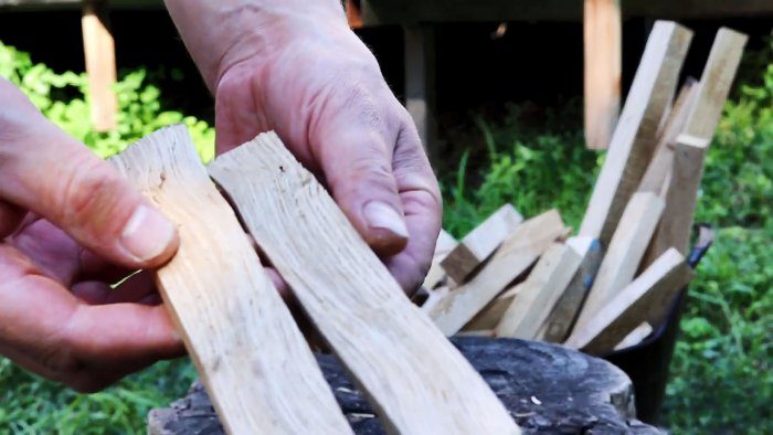 Теперь нужно расколоть топором сделанные заготовки вдоль. Полученные сколотые поверхности будут создавать нашу декоративную поверхность.