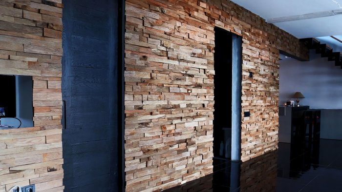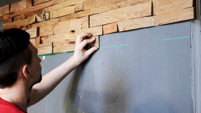 Стенку, которую нужно задекорировать, предварительно следует покрасить в темный цвет. Затем на ней рисуется горизонтальная линия, и которой наклеивается первый ряд дощечек сколом наружу.
