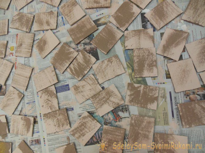 Одиннадцать кирпичей, предназначенных для отделки очага, окрашиваем кистью в темный шоколад. Сверху слегка тонируем золотом и откладываем их отдельно.