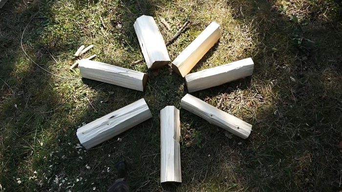 Бревно с помощью пилы распускается вдоль на 6 сегментов. Они пилятся на 2/3 высоты полена.