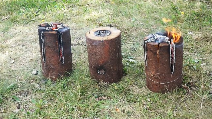 Розжиг такой финской свечи тоже не вызовет затруднений, но только при использовании хорошо горящей растопки. В ее качестве можно использовать кусочек ваты, смоченный в парафине, или обрывок резины, к примеру, от камеры велосипеда или автомобиля. Горящая растопка помещается через боковое отверстие в центральное. Разжечь бревно только щепой будет сложнее, но тоже возможно.