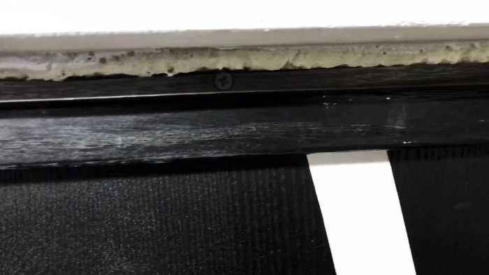 Далее нужно приклеить ламинат сверху. Для этого со стороны рамы его требуется на что-то уложить. В данном случае створка открывается по горизонтали, поэтому удалось опереться на подкладки, уложенные прямо на нее. В обычном же случае можно временно приклеить двусторонним скотчем на раму окна дощечки или рейку, чтобы опереть на них ламинат.
