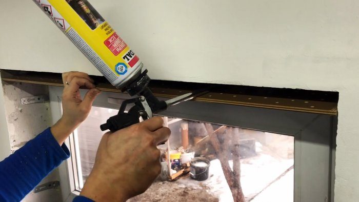 После этого наносится монтажная пена, и подоконник укладывается. Сверху его необходимо прижать любым грузом пока пена не схватится.