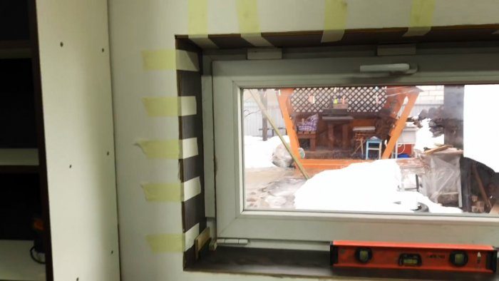 Боковые стенки откосов приклеивать уже намного проще. Достаточно их просто зафиксировать малярной лентой. Если черновые откосы кривые, и на отдельных участках пришлось наносить больше пены, то чтобы их не выгнуло, можно распереть боковины рейками.