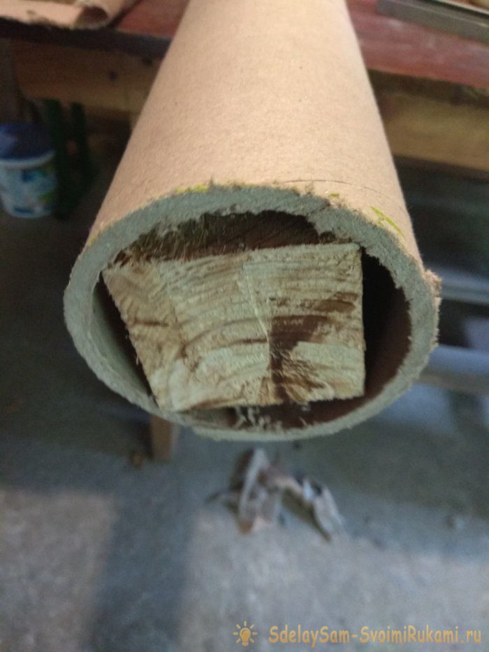 Отрезав нужный размер трубы, и сверху и снизу необходимо закрепить кусок деревянного бруса. После этого можно скрепить верхнюю и нижнюю часть, соединив ее с трубой сверху и снизу. Прежде чем закручивать саморезы, лучше просверлить отверстия, для того чтобы бруски не дали трещины.