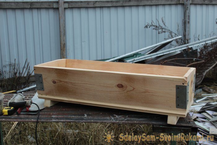 Теперь теми же саморезами длиной 65 мм прикручиваем эти боковые стенки к дну корыта (4-5 штук) и к торцевым стенкам (2 штуки). И вот и имеем почти готовое корыто.