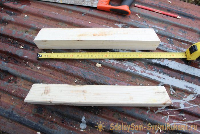 Для начала нам нужен брус 50х50 мм длиной примерно 70 сантиметров. Предварительно, брус надо постругать на рубанке, и выпилить две заготовки в виде трапеции со сторонами 30 и 34 сантиметра.