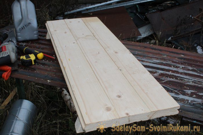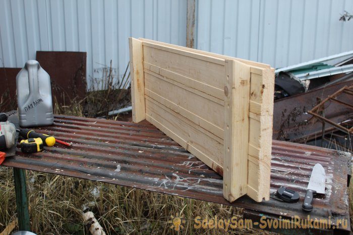 Далее берем половую доску со шпунтом шириной 10,5 см. Для корыта нам надо три куска по одному метру длиной. Собираем три куска этой доски шпунт в паз, и через ножки все скрепляем саморезами длиной примерно 65 мм. И вот у нас готово дно корыта.