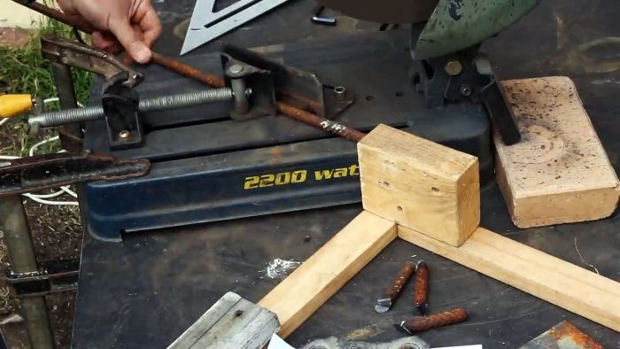 Поскольку трубки ножек изначально срезаны под прямым углом, а после приварки располагаются нижними торцами к земле не горизонтально, то их нужно подрезать. Для этого из фанеры делается простой упор с фиксатором для болгарки, и с его помощью ножки торцуются заново. При этом чашу нужно поставить на плоскую поверхность, и тогда уложенный упор с болгаркой позволит все отрезать идеально ровно.