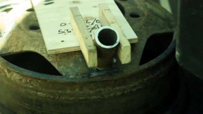 Если есть желание все сделать идеально ровно, то для позиционирования ножек можно собрать кондуктор. Для этого берется отрезок фанеры и прикладывается к диску, после чего на нем маркером отмечаются 4 крепежные отверстия и окружность под ступицу. Затем на фанеру прибиваются 2 рейки так, чтобы расстояние между ними соответствовало ширине ножки. Позиционируя кондуктор разметкой по отверстиям на диске, и закрепляя его гвоздиками, можно поочередно симметрично приварить все ножки.