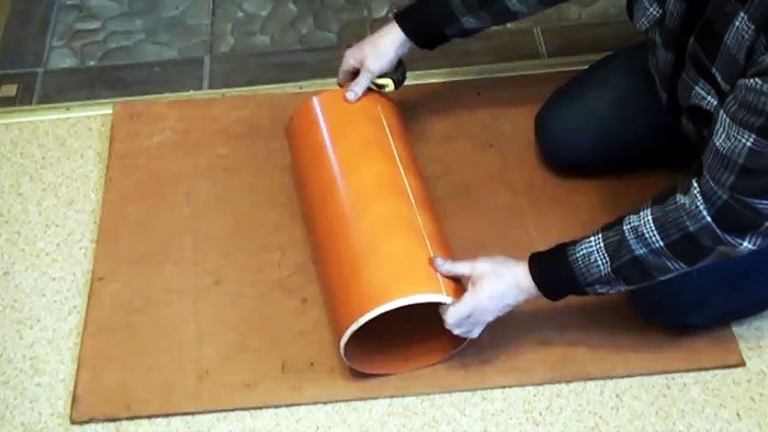 От канализационной трубы отрезается заготовка 40 см. Вдоль нее делается продольный надрез. Материал отлично режется болгаркой, при этом он не оплавляется, конечно, если используется хорошая труба с толщиной стенки 4 мм.