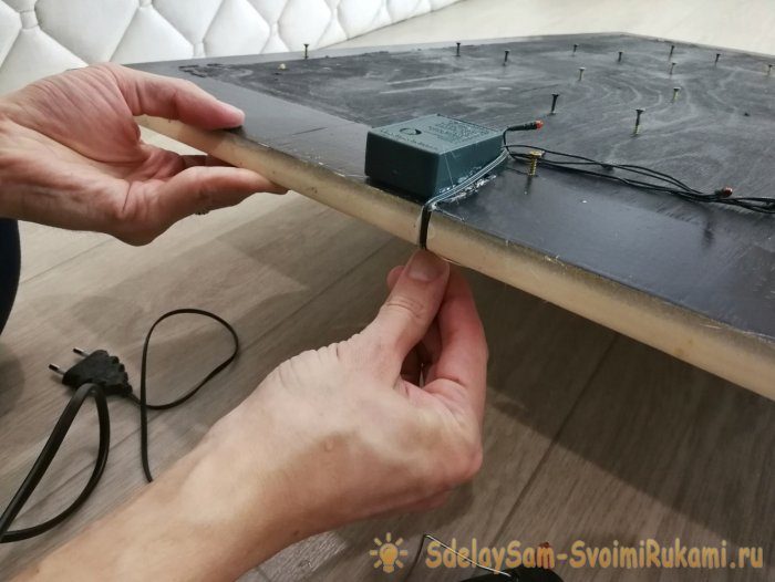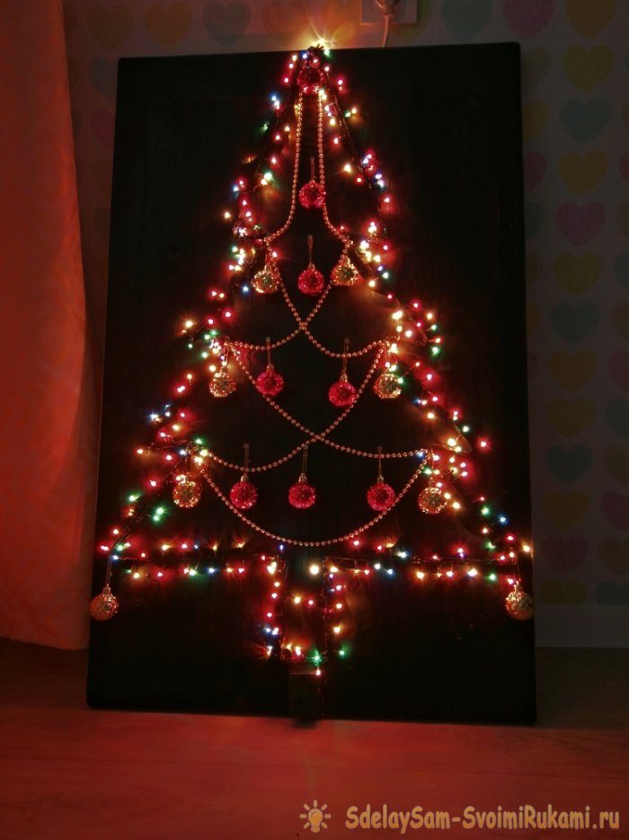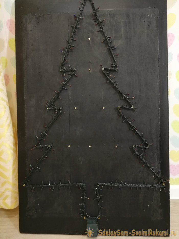 Я покрасил мебельный щит в черный цвет. Я хотел, чтобы фон растворялся в темноте. Нарисовал силуэт елки, а затем вкрутил саморезы по углам.