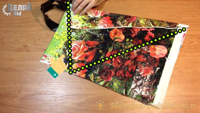 После изгиба отрезаем лишнее, сверху начинаем резать по условной линии к краю обрезанного бока пакета, а дальше от края вниз до хвоста змея.
