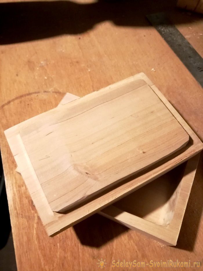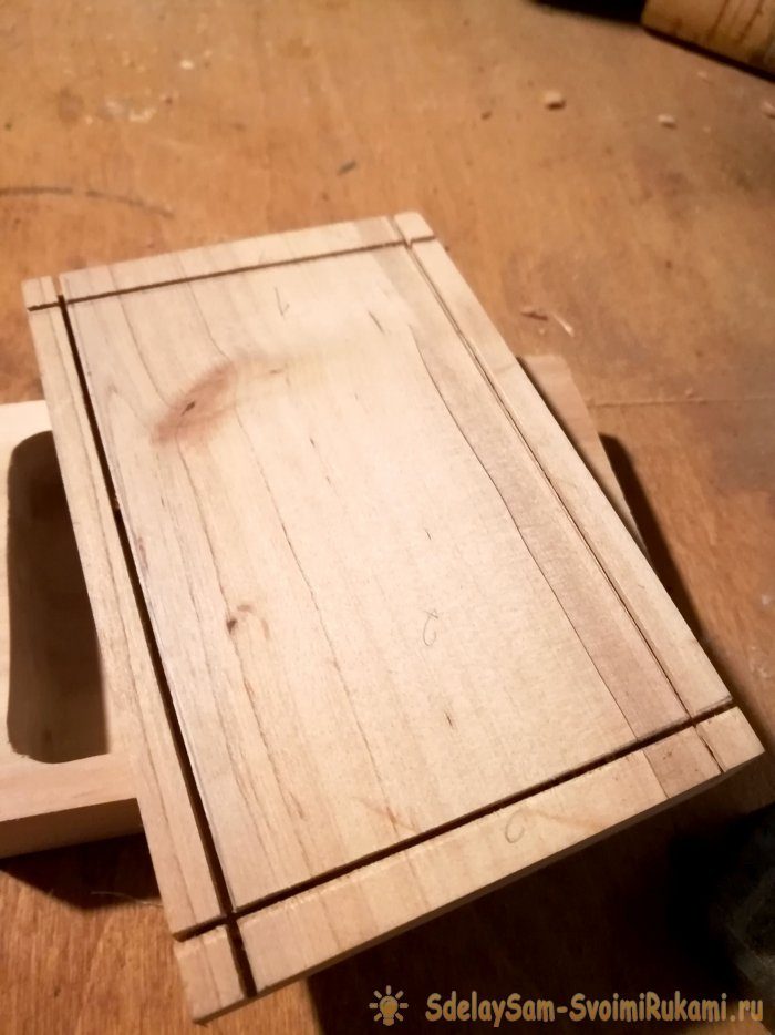 5) Для того чтобы шкатулка могла закрываться, в ее крышке сделаем выступ. При помощи ножовки