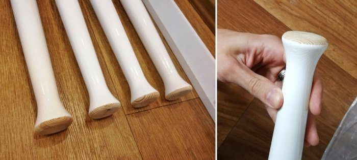 Следующий шаг – изготовление ножек. В качестве ножек буду использовать балясины. Взял 4 штуки и отрезал лишнее.