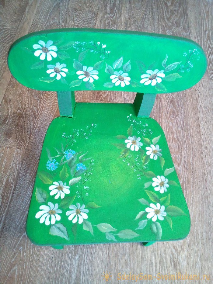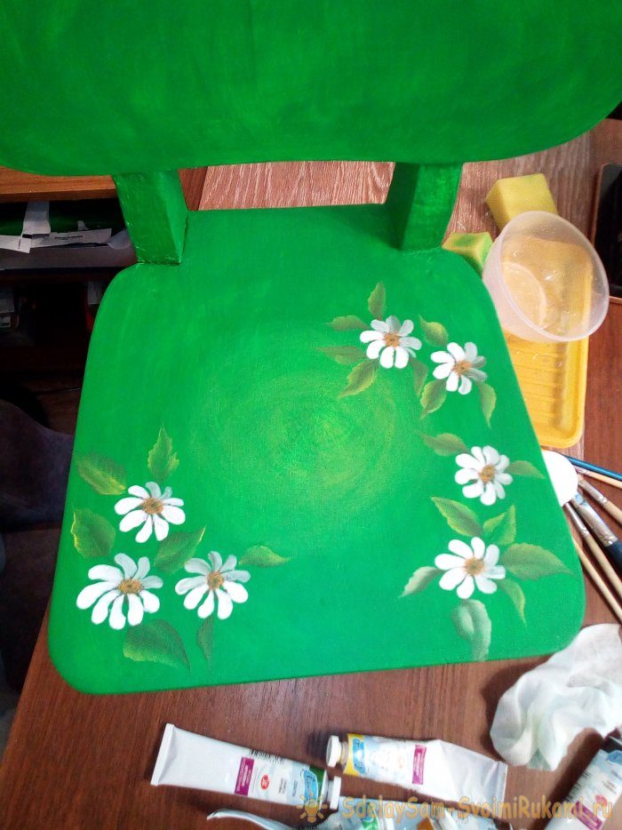 Затем покрыла весь стульчик зеленой акриловой краской. Покрывать пришлось на три слоя.