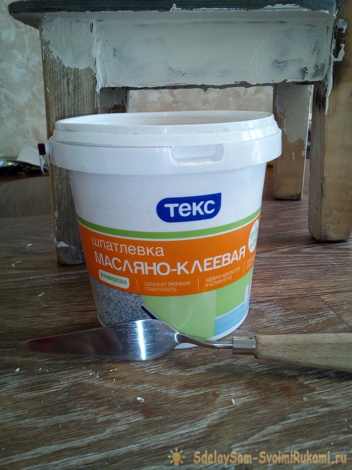Когда клей хорошо просох, я промазала все неровности и отколы шпатлевкой. У меня она масляно-клеевая.